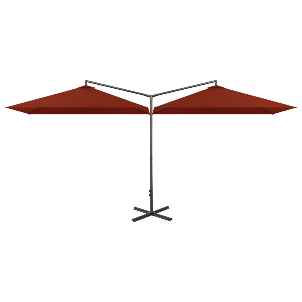 Този чадър е изработен от полиестер, който ви осигурява оптимална защита срещу слънчево изгаряне. Здравият стоманен прът, заедно с твърди стоманени ребра, поддържат чадъра стабилен. Има стоманена кръстосана основа за добавяне на стабилност. Дизайнът на два разположени един до друг сенника го прави практичен, елегантен и уникален, което не само осигурява по-сенчесто място, но и го прави привлекателен за всяко външно пространство. Освен това може лесно да се отваря и затваря.