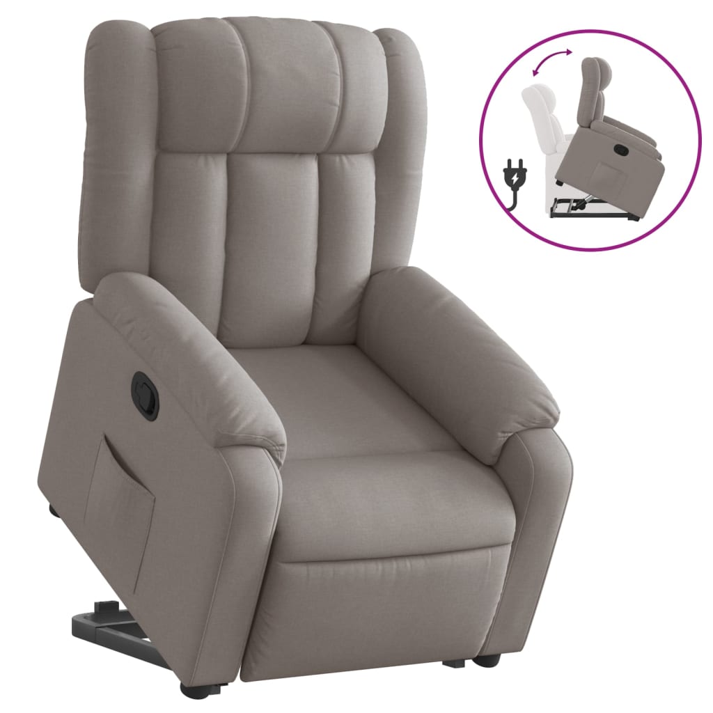 Oblegnete se i se otpusnete v tozi izklyuchitelno komforten izpravyasht naklonyaem stol! Funkciya za povdigane: Tozi stol reklayner e oborudvan s elektricheski dvigatel s funkciya za povdigane. Blagodarenie na funkciyata, koyato izbutva celiya stol nagore, mojete lesno da stoite, bez da natovarvate gurba i kolenete si s prosto natiskane na butona. Funkciya za ruchno naklanyane: Tozi naklanyasht se stol ima drujka ot dyasnata strana. Mojete ruchno da nastroite postavkata za kraka i oblegalkata do proizvolna poziciya spored vasheto udobstvo s prosto izdurpvane na drujkata. Tazi funkciya pozvolyava maksimalen naklon ot 135 gradusa. Osven tova oblegalkata moje burzo da se vurne na purvonachalnoto si myasto s lesno izdurpvane na drujkata. Udobno sedene: Debelo podplatenata sedalka, oblegalkata i shirokite podlakutnici, pokriti s tekstil, osiguryavat uyutno i toplo useshtane, koeto vi kara da se chuvstvate kato v pregrudka, dokato sedite. Tukanta se otlichava sus sempul i izchisten vid i e dishashta i izdrujliva. Udoben stranichen djob: Tozi fotoyl ima stranichen djob, za da durjite osnovnite si veshti lesnodostupni. Zdrava i stabilna ramka: Ramkata, izrabotena ot durvo i metal, osiguryava zdrava struktura i stabilnost. Tozi naklanyasht se fotoyl e udoben i izdrujliv.Cvyat: TaupeMaterial: Plat (100% poliester), metal, shperplatPulnejen material: Dunapren, PP vlaknaRazmeri sednalo polojenie: 78 x 92 x 98 sm (Sh x D x V)Razmeri v legnalo polojenie: 78 x 149 x 77 sm (Sh x D x V)Shirina na sedalkata: 50 smDulbochina na sedalkata: 57 smVisochina na sedalkata ot zemyata: 42-44 smVisochina na podlakutnika ot zemyata: 58 smS elektricheski motor za funkciya za avtomatichno izpravyane Vhod: DC 24 V, 1,5 A Izhod: 100-240 V~, 50-60 Hz Maks. tovaronosimost: 110 kg Neobhodim montaj: Da Maksimalno 110 kg na sedalka.Tozi ured moje da se izpolzva ot deca na vuzrast ot 8 godini i poveche i ot lica s namaleni fizicheski, setivni ili umstveni sposobnosti ili s lipsa na opit i poznaniya, ako sa poluchili nadzor ili instrukcii za bezopasno izpolzvane na ureda i razbirat svurzanite s nego opasnosti. Decata ne tryabva da si igrayat s ureda. Decata ne tryabva da pochistvat i da izvurshvat potrebitelska poddrujka bez nadzor.